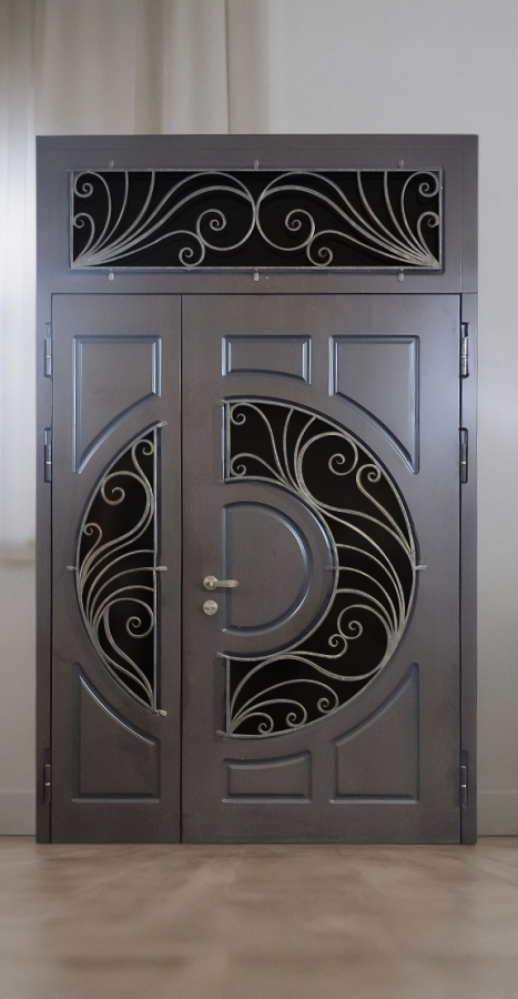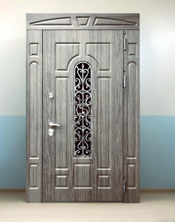 Парадная дверь арочного типа с отделкой МДФ, остекление